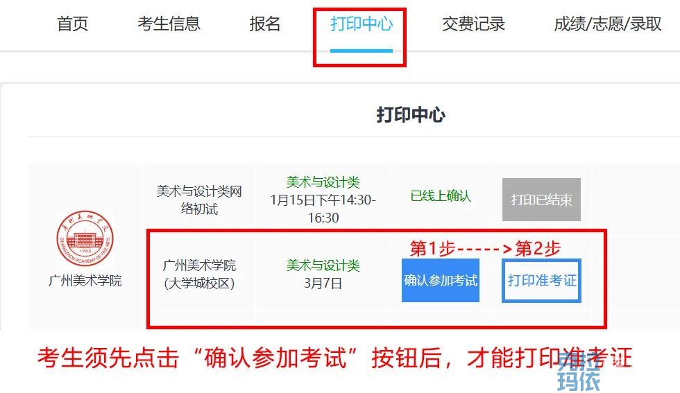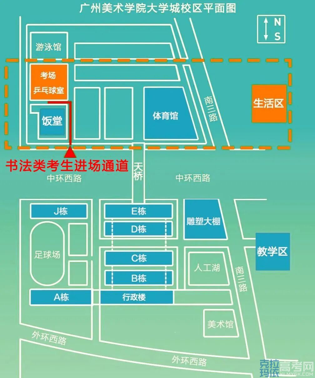 一 我校不设现场确认及打印准考证,考生须在3月3日10:00-3月6日10:00使用电脑浏览器登陆我校报名系统:https://user.artstudent.cn/login 确认参加考试并打印准考证,按准考证相关要求备考。提示:只能在电脑网页版的“打印中心”菜单里面打印准考证。 二 我校在广东省设有4个考点,考生所属考点以考生打印的准考证上显示为准,其中书法类考试仅安排在广州美术学院(大学城校区)考点;请考生仔细阅读准考证上的考场规则(见附件)及以下各考点的温馨提示,提前做好赴考的相关准备: 4、深圳市美术学校考点:广东省深圳市罗湖区东盛路68号,深圳市美术学校。 三 书法类考试温馨提示 考点位于广州市番禺区大学城外环西路广州美术学院大学城校区。考试前,学校考场不开放提前进校查看,请考生尽量在考试当天提前1小时到达考点,所有考生务必从大学城中环西路广州美术学院生活区6号门岗(导航:广东省广州市番禺区大学城中环西路广州美术学院生活区饭堂)进校,考生须按照考点要求依次排队进入考场区域。 四 美术与设计类各考点温馨提示 1、广州美术学院(大学城校区)考点: 考点位于广州市番禺区大学城外环西路168号广州美术学院大学城校区。考试前,学校考场不开放提前进校查看,请考生尽量在考试当天提前1小时到达考点,所有考生务必从外环西路的教学区南门入口处靠近美术馆(2号门岗)进校,凭专业准考证、身份证参加考试。学校生活区饭堂可提供就餐服务,考生可在饭堂就餐或自行在校外解决用餐。